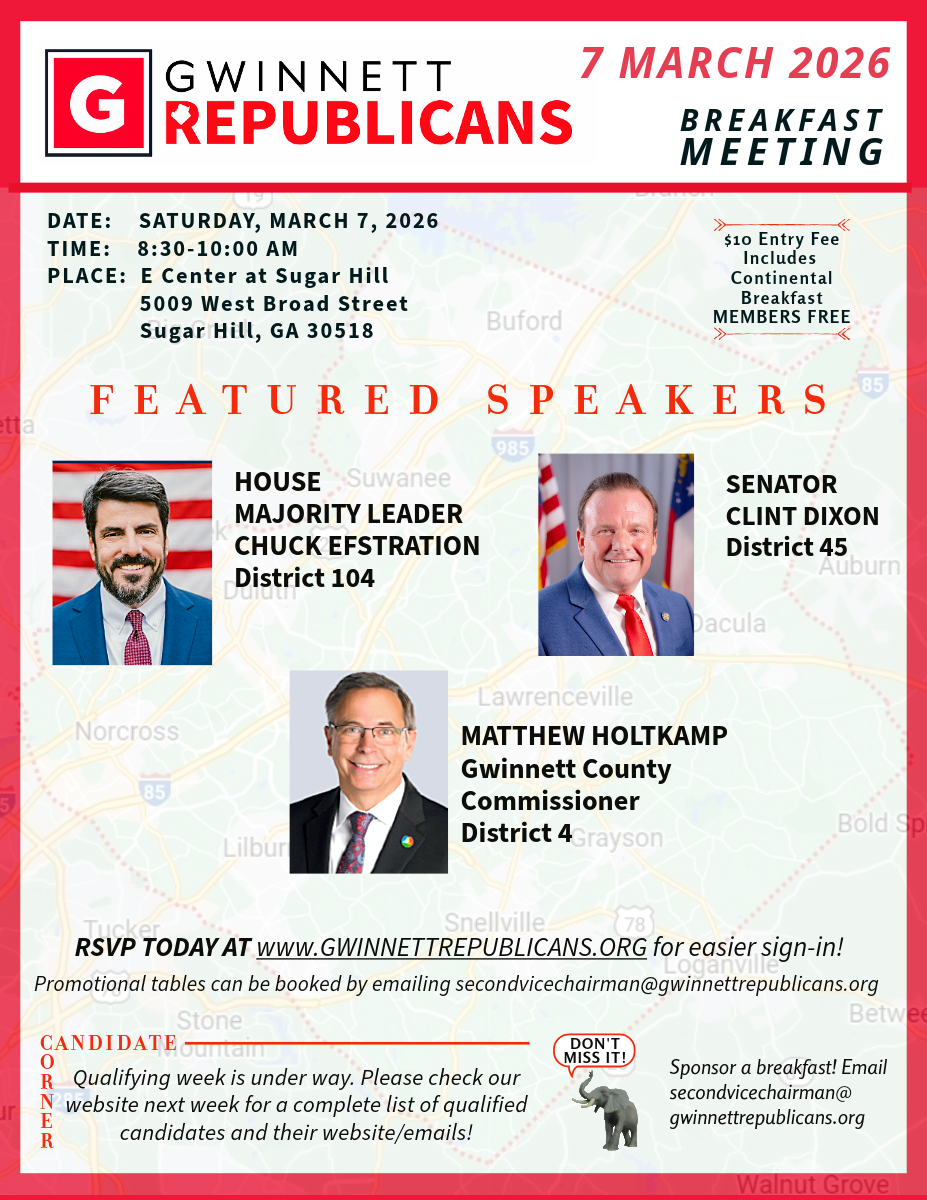 *By providing your number and/or email address you are opting into text messages and emails from the Gwinnett County Republican Party. Reply STOP to stop. Reply HELP for help. Text messaging originator opt-in data and consent will not be shared with any third parties unless required by law. Unsubscribe to unsubscribe. Message and email frequency varies. Message and data rates may apply. We do not sell or share information with third parties.
